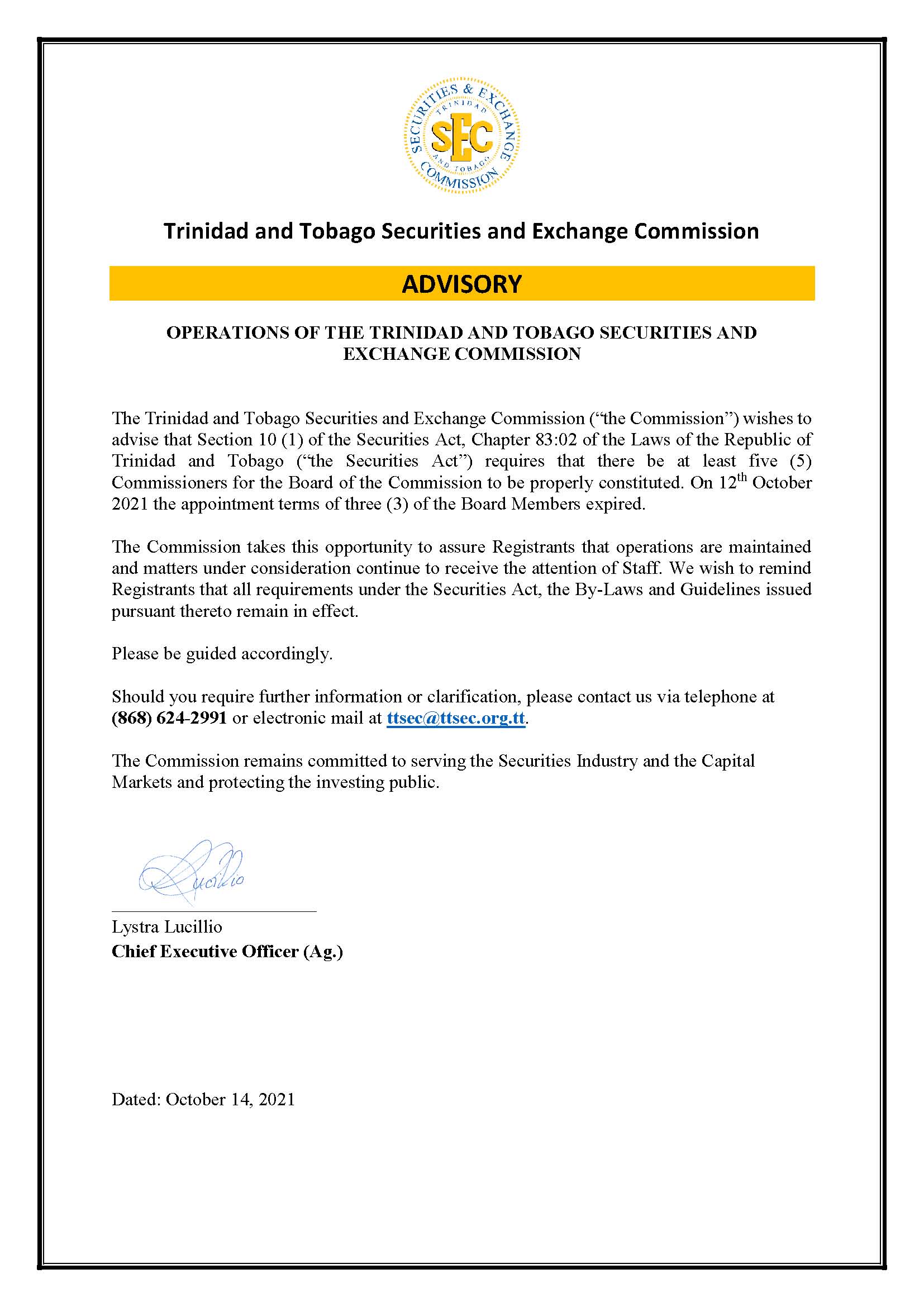 Registrant Advisory October 14 2021